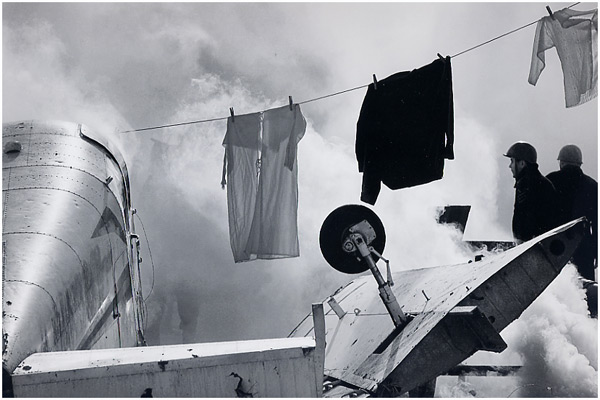<Guerra e pace> è il titolo della sequenza di fotografie eseguita da Roberto Del Vecchio di Ferrara. Dell’intero portfolio è stata premiata l’immagine più emblematica, quella che lascia basito l’osservatore. Qui infatti lo sfondo è velato dal fumo di un improbabile incendio; dico improbabile ma l’aspetto denotativo mostra effettivamente un velivolo atterrato fortunosamente in un cortile dove appaiono dei panni stesi. A destra due personaggi con elmetto sembrano in tutto e per tutto due vigili del fuoco, intervenuti per fermare l'incendio.