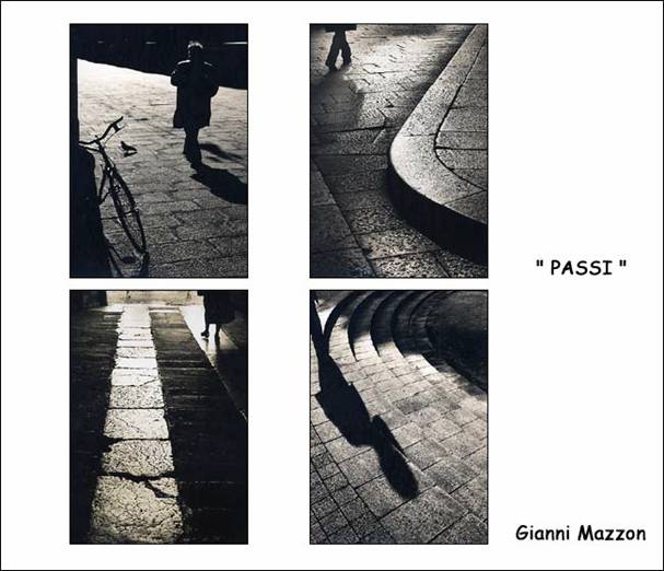 Al primo posto si è classificato Gianni Mazzon con le opere “ Passi ”. L’autore ha specificato che queste fotografie sono state fatte in luoghi e tempi diversi. Se da un lato questo fatto è superfluo, Mazzon insegna che è possibile costruire una sequenza significativa di immagini pescando anche dal passato. Molti fotoamatori hanno nel cassetto decine d’immagini solitarie che aspettano solo di essere affiancate ad altre simili. Qui dunque, c’è un lavoro di ricerca, c’è la volontà di effettuare lo scatto solo nel momento prestabilito, non c’è fretta, c’è meditazione e la sottile sensazione di aver colto l'emozione di quel magico momento.