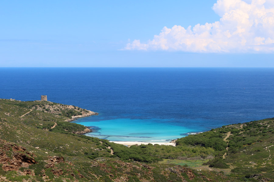 Dall'alto si osserva la meravigliosa bellezza di Cala d'Arena dove due mari dai colori diversi s'incontrano. La vegetazione vicino alla spiaggia è diversa e più rigogliosa con ginepro, mirto e erica.