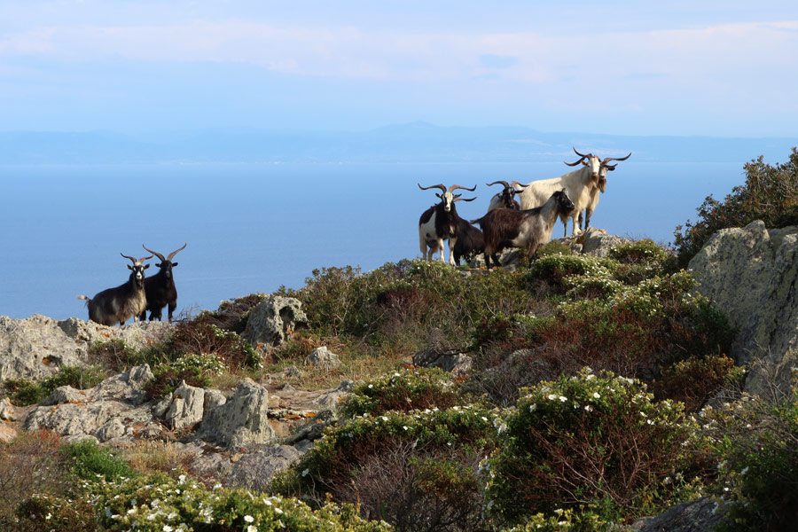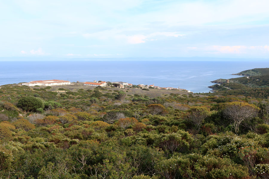 In primo piano c'è Campo Perdù, la più estesa delle colonie penali e s'intravede il puntino bianco dell'ossario sulla sinistra nella foto. Sono le ore 16.25 e cominciamo ad avere le visioni mistiche accompagnate da miraggi marini e montani. Scendiamo dunque fino alle Case Bianche altra stazione penale sotto lo sguardo vigile delle capre bicornute: