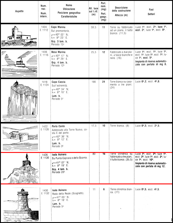 " Il Libro dei Fari italiani " di Camillo Manfredini e Walter Pescara Editore Mursia, riporta numerose pagine con la tabella di cui sopra; la sequenza termina con il Faro della Vittoria di Trieste il cui numero progressivo nazionale è pari a 4376.