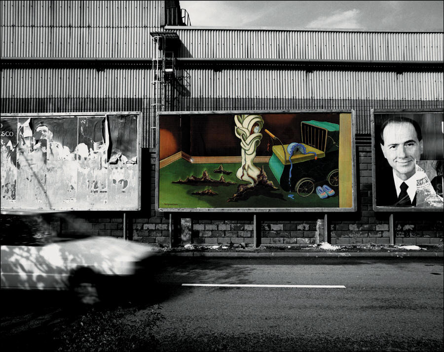 L'ironia di queste immagini dovrebbe essere abbastanza evidente; c'è un Berlusca accanto ad un opera surrealista di Harry Carlsson che si potrebbe intitolare lo sfaladamento della realtà....