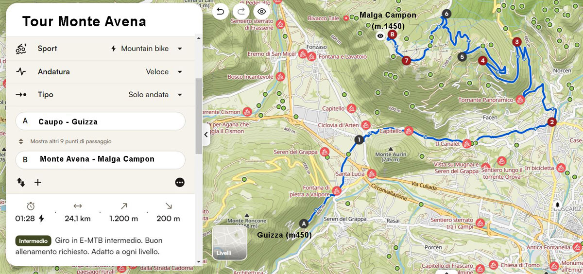 Discesa al Croce d'Aune e poi giù fino a Pedavena con svolta a destra per Arten e salita finale per la Guizza. Quei due tornanti al 20 %.......maledetti. Lì il turbo è d'obbligo!