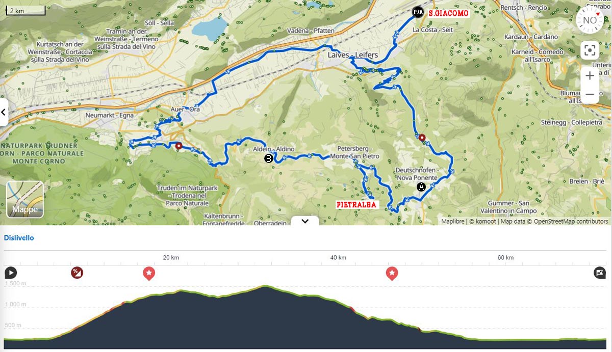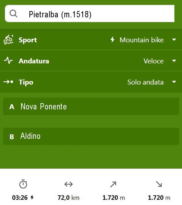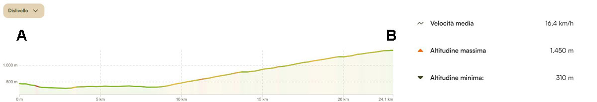 Ho impiegato ( a parte le soste per fotografare ) esattamente il tempo indicato da Komoot ossia 1 h e 28 min per coprire i 24 km del percorso caratterizzati da un dislivello di circa 1200 metri.