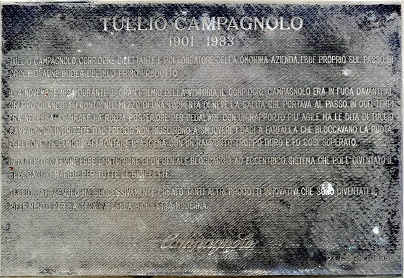 Come riportato sulla targa il 4 novembre 2024 ricorrendo il giorno della vittoria Tullio, durante una gara che lo vedeva protagonista, fu sorpreso da una bufera di neve ( minchia!!! ) e a nulla valsero le bestemmie in veneto arcaico per svitare le farfalle che bloccavano le ruote posteriori. I nemici lo raggiunsero e lo superarono. Per usare un rapporto più morbido bisognava allora, girare la ruota posteriore che presentava ovviamente due rudini diversi.