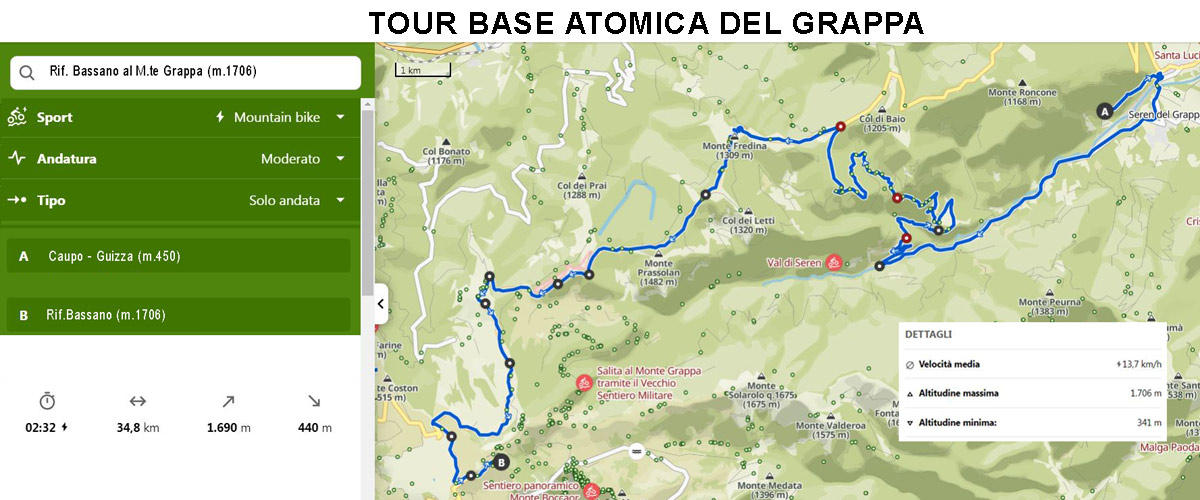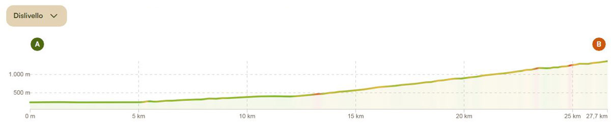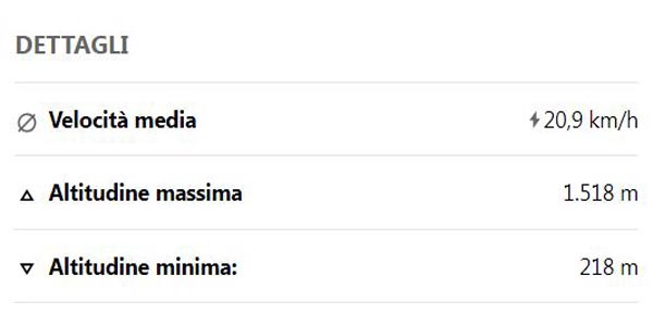 La mappa riporta solo il percorso di andata e lo stesso dicasi per il dislivello. A partire da Pedavena la salita diventa più impegnativa e la pendenza media risulta essere del 7% con punte superiori all'11%.
