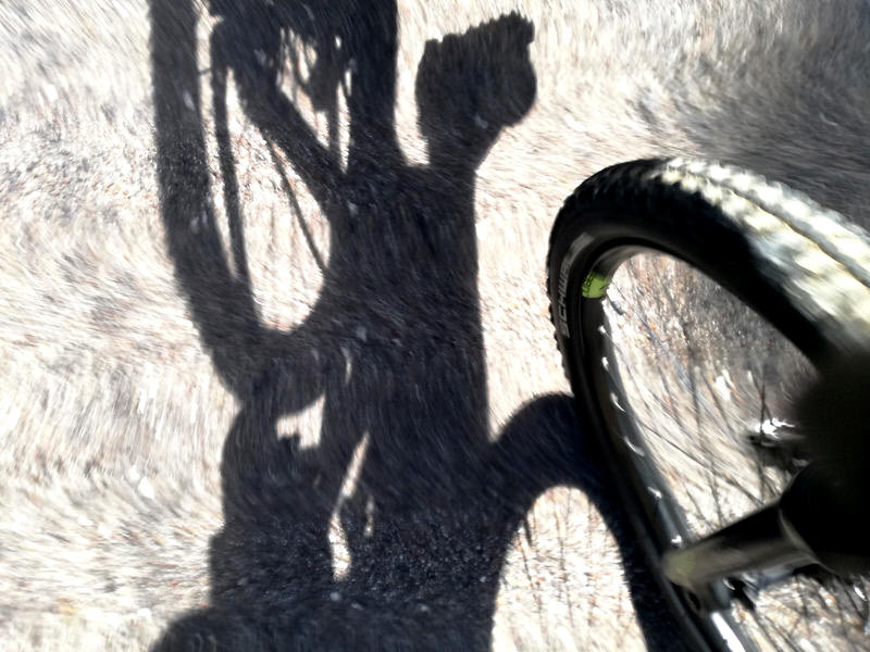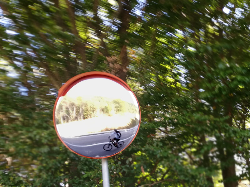 Come è possibile notare nella foto di destra i maldestri tentativi di porre il mezzo auto-erotico chiamato cellulare nella tasca dello zaino, hanno prodotto quell'impossibile immagine dove pare che l'asfalto si deformi causa lo sforzo del ciclista.