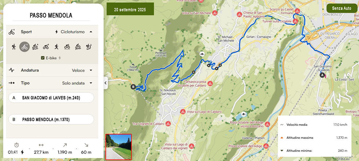 E' il giorno 10 giugno 2025......dobbiamo allenarci che la gamba tremola. Partenza ore 9.30 da Santiago in compagnia del cognato con la 750 per raggiungere prima il Passo Palade e poi il Passo Mendola e scendere in picchiata a casa. Raggiungo Nalles in modalità ECO. La gamba funziona e spingo a più di 25 km/h.