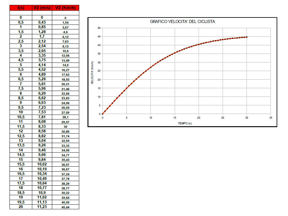 La tabella riporta solo alcuni dei dati necessari alla costruzione del grafico. Possiamo notare che la velocità limite è circa uguale a 45Km/h in accordo con quanto indicato nel paragrafo precedente dato che sono stati usati gli stessi parametri. Notiamo inoltre che inizialmente la velocità cresce linearmente dato che la resitenza del mezzo non fa sentire i suoi effetti. In altri termini il ciclista accelera ma ovviamente sempre di meno fino a raggiungere la velocità limite.