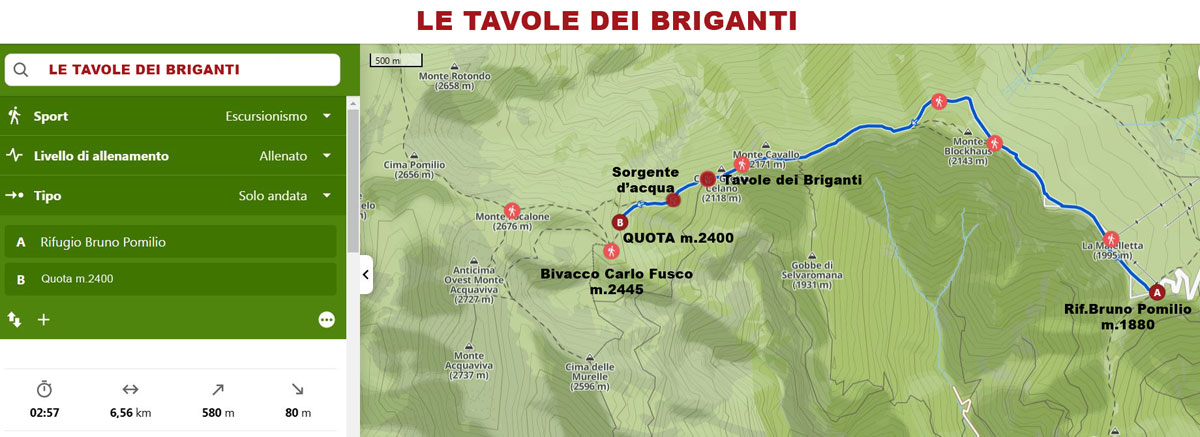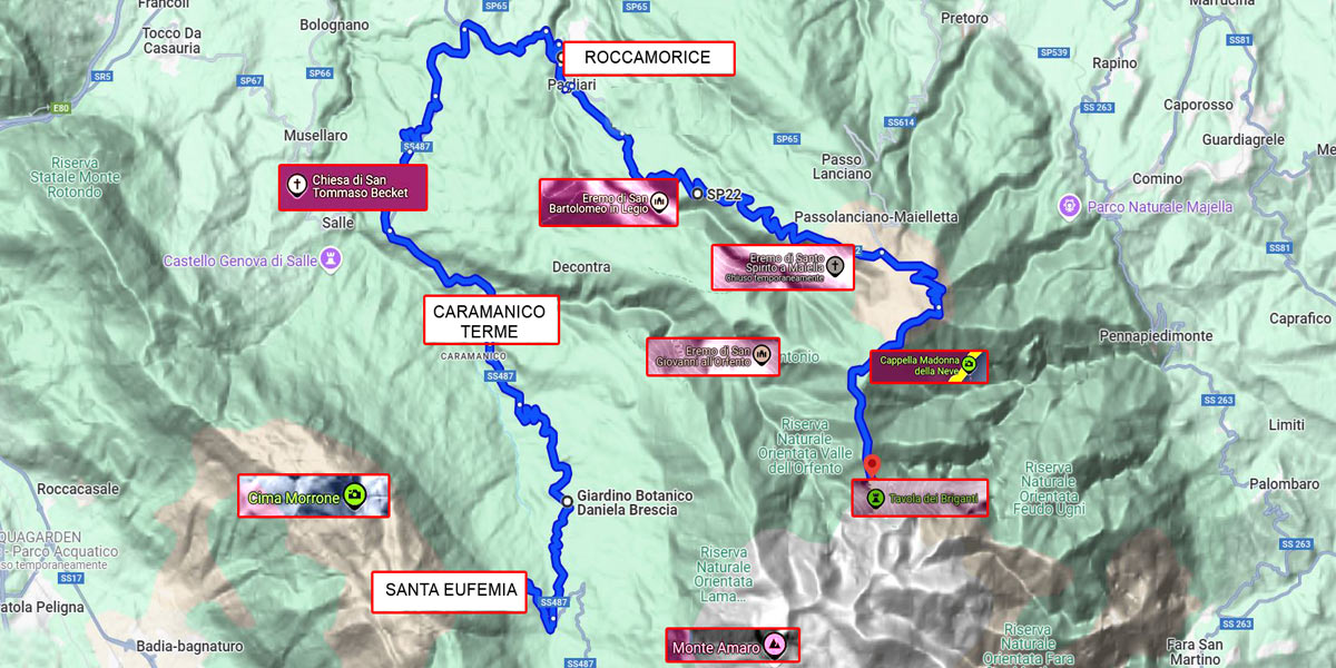 Seguiamo dunque il percorso segnato in blu in un ideale spostamento in senso orario da Roccacaramanico - Santa Eufemia al Blockhaus o più precisamente alla Tavola dei Briganti sulle pendici settentrionali della Maiella.