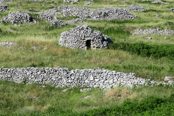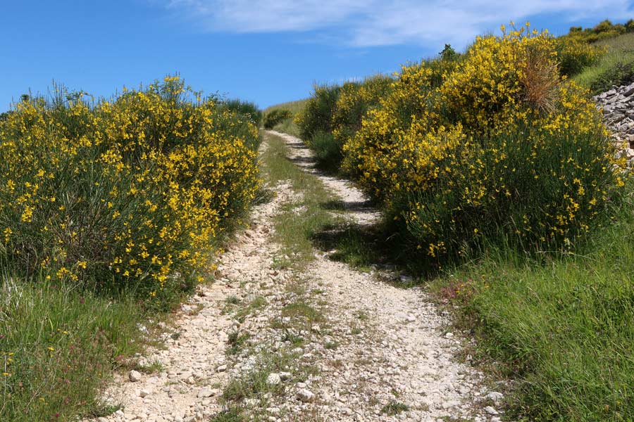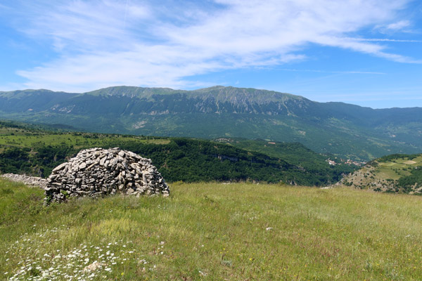 Percorrendo l'iniziale pianoro non si ha l'idea dell'immane lavoro di spietramento effettuato dai pastori; in piedi c'è ancora qualche capanno e qualche muretto a secco ma....mancano qui, come altrove le greggi!
