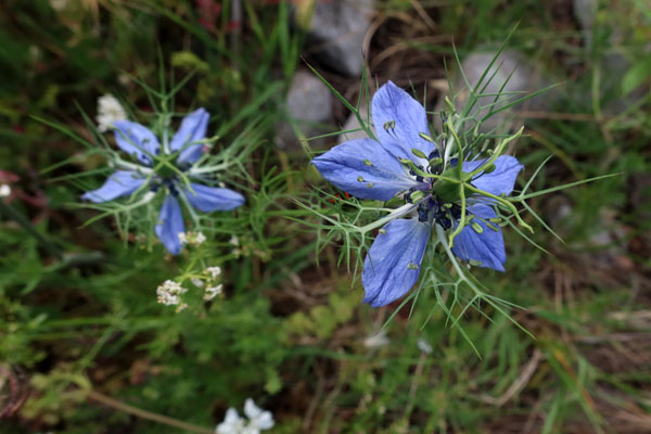 La " fanciullaccia " è davvero spettinata ma la sua forma é incredibile; le foglie superiori ( brattee ) sono modificate e avvolgono i petali azzurri. Stami, antere e pistilli fanno il resto in una combinazione alquanto complessa.