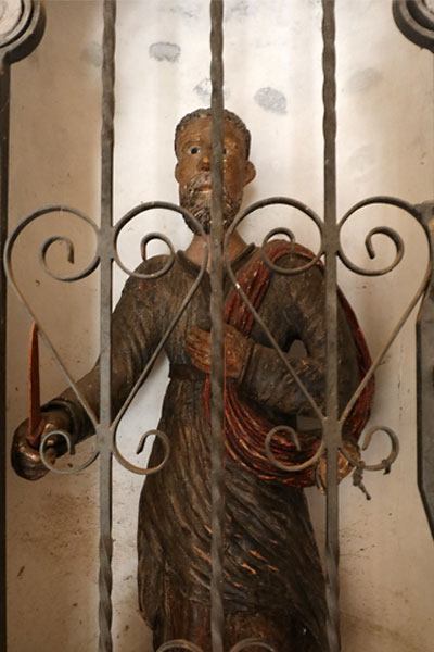 Lo spazio interno è costituito da due stanzette e nella prima, in una nicchia è posta una statua lignea del santo con un coltellaccio, simbolo del martirio. La tradizione molisana lo vuole scuoiato a Benevento. Sarebbe poi arrivato a Bojano con la sua pelle in mano che qui appare avvolta a mo di corda ad esclusione del volto. Pare che morì poco dopo e chissà perchè......