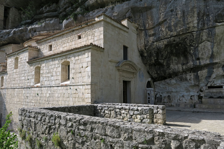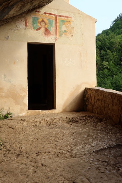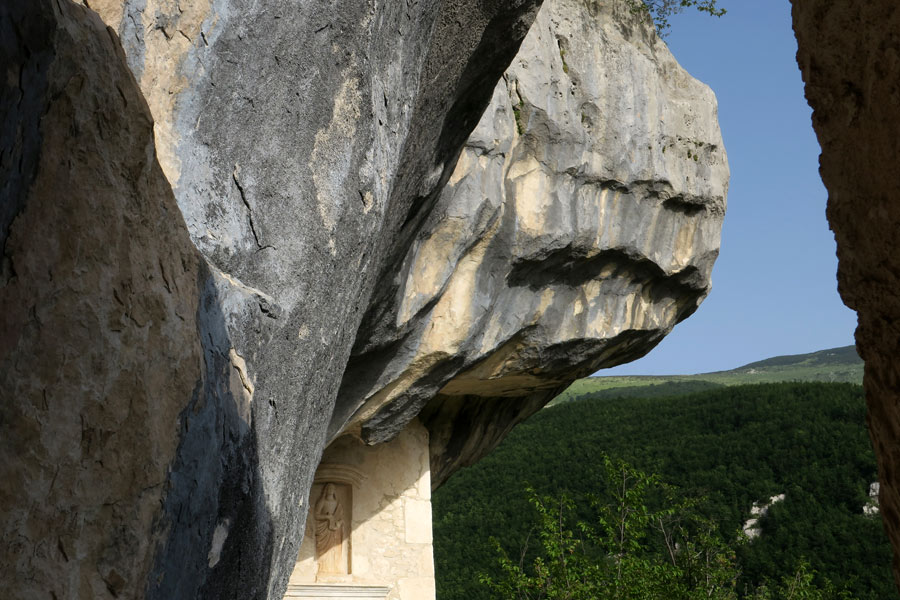 La Maiella è Maia madre ma anche santa proprio per il numero di eremitaggi incastonati tra le sue pareti. Pare sia seconda solo alle Meteore e alla Capadocia. Passiamo allora in rivista l'ultimo eremo raggiungibile in auto a qualche chilometro dal precedente. Davanti alla chiesa c'è un grande spiazzo dove sulla destra è stata scavata la montagna per far posto ad un grande e lungo abbeveratoio. Dunque non mancavano l'acqua, le greggi e San Antonio Abate protettore del bestiame.