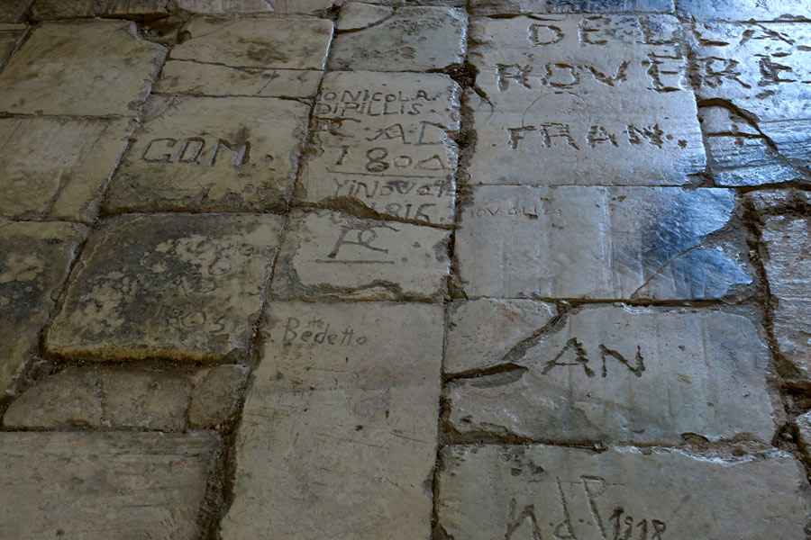 Qui come in altri luoghi legati al sacro, non mancano le firme dei visitatori che muniti di scalpellino hanno lasciato un segno del loro passaggio. Trattasi di fedeli o di vandali ante litteram?