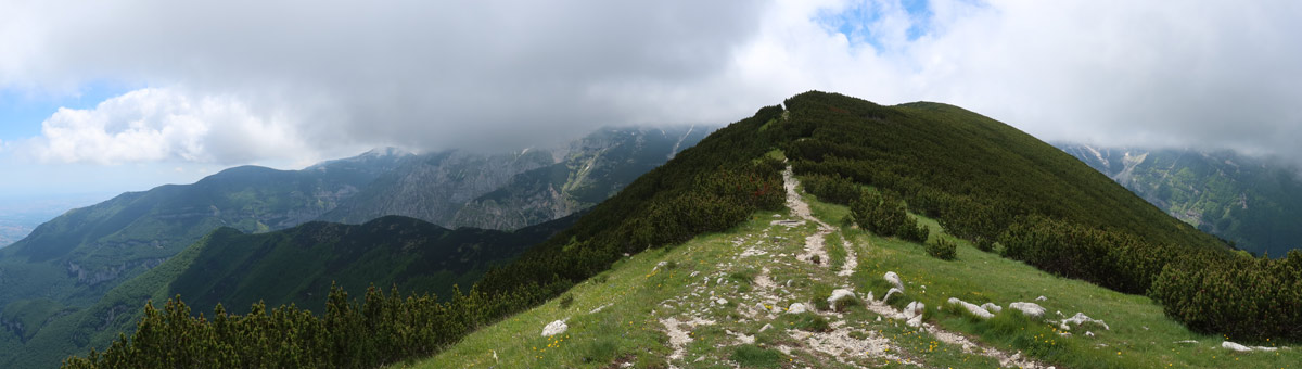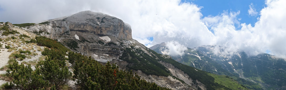 Le nuvole per un attimo lasciano trasparire le vette più alte ancora coperte di neve:
