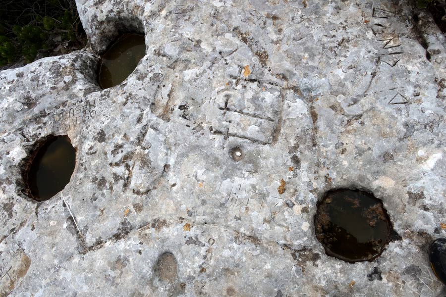 Oltre alle coppelle che non è chiaro se sono naturali o scavate, la zona è ricoperta da scritte che riportano nomi, date e simboli sacri.